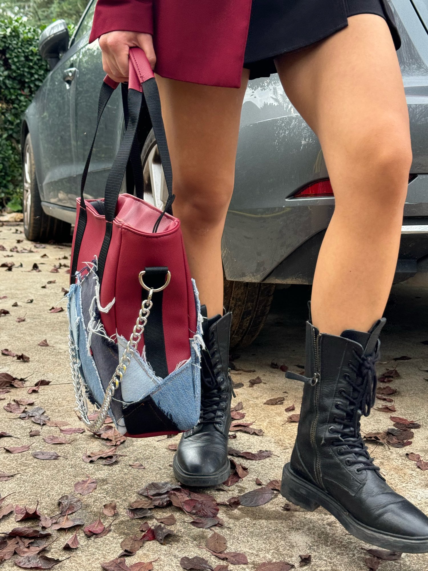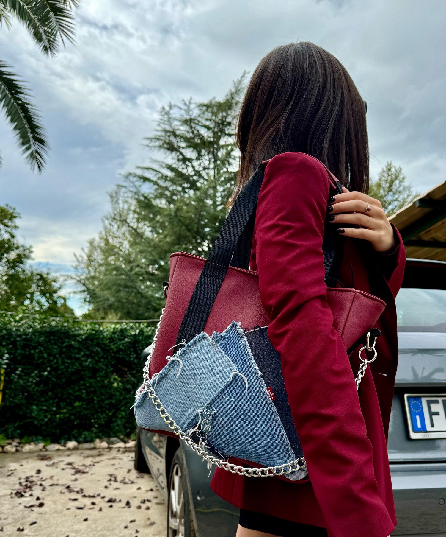 EN : Athena bag made of vintage jeans patchwork and Bordeaux eco leather. With top zip closure. Internal pockets and internal lining.