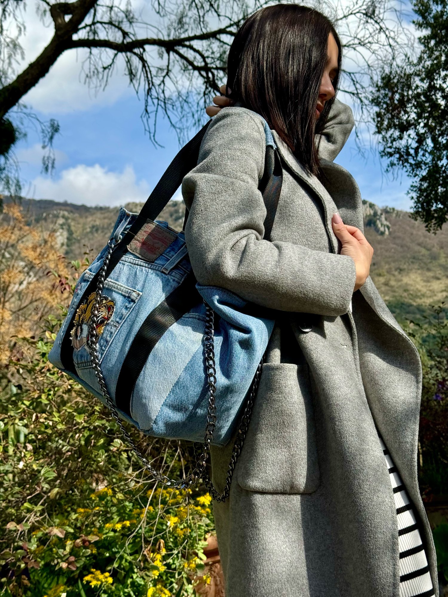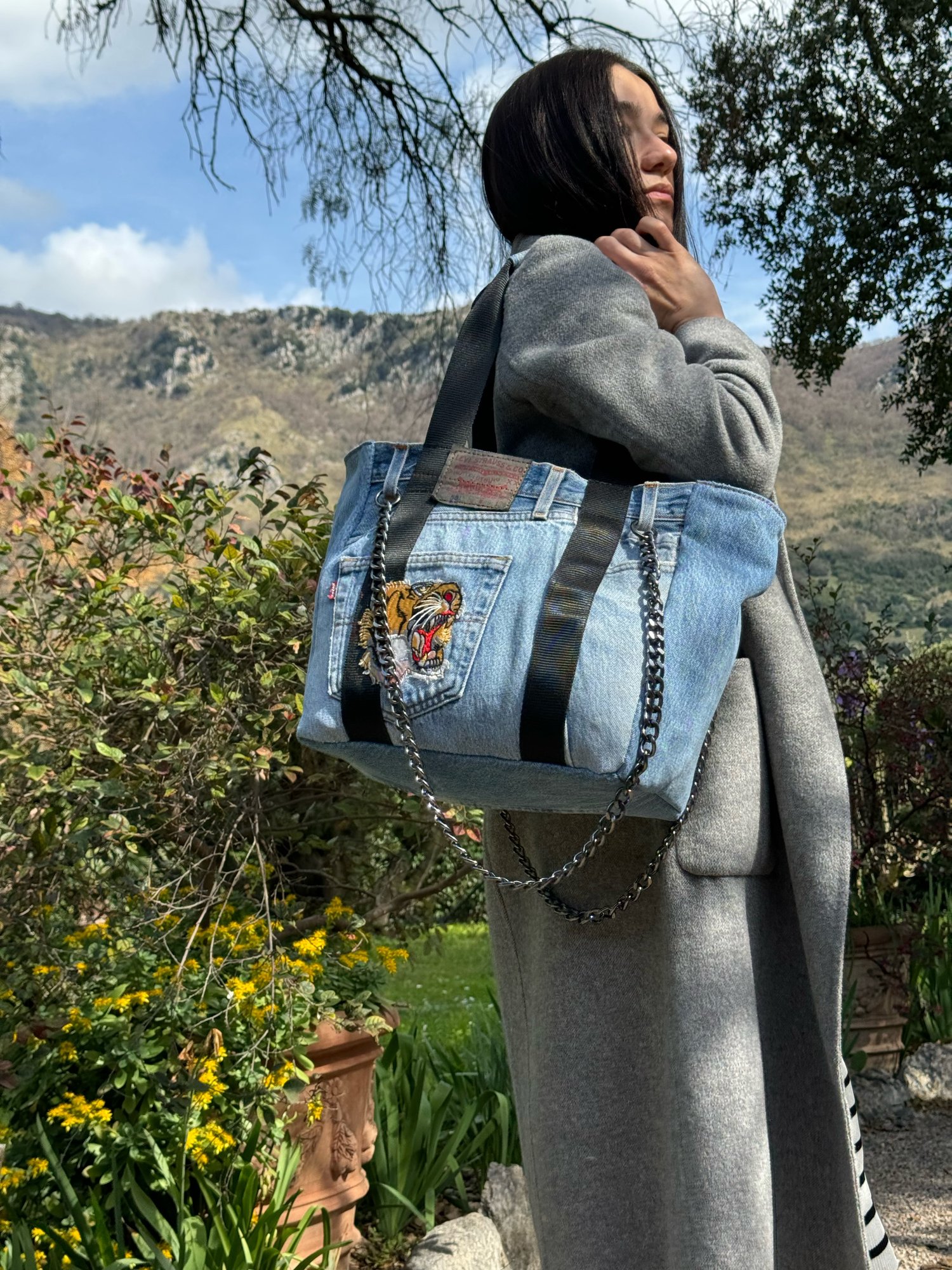 IT: Borsa realizzata in jeans vintage colorazione celeste e manici in cinghia colore nero a contrasto. Con particolare di toppa a tigre ricamata a filo applicata con macchina da cucire sulla parte frontale della borsa.