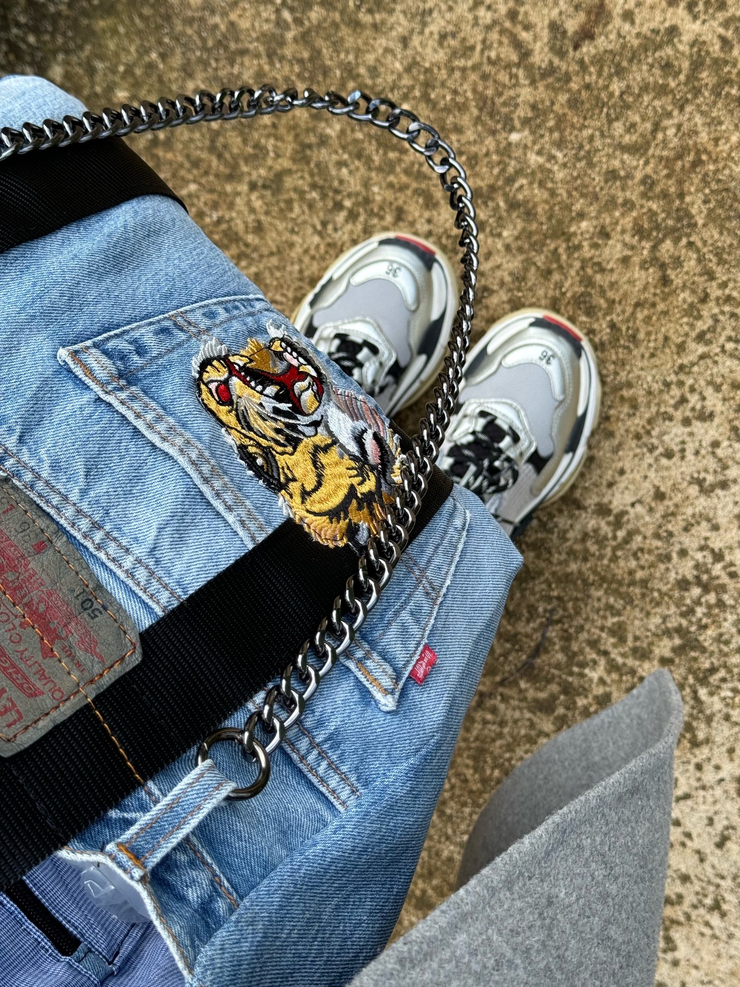 EN: Bag made of light blue vintage jeans and contrasting black strap handles. With thread-embroidered tiger patch detail applied with a sewing machine on the front of the bag.